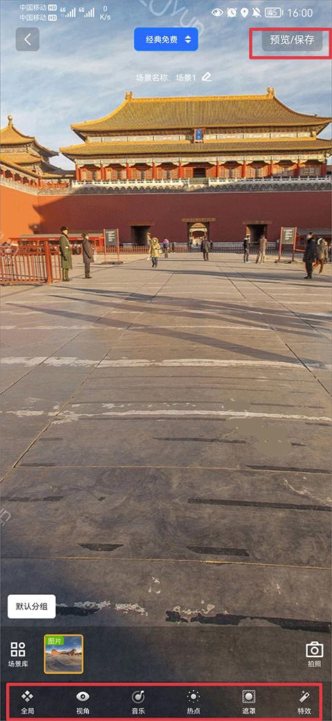 4、创建完成后可以为创建的全景图进行全局设置、视角设置、音乐、热点、特效的添加等来完善化全景图,制作完成后点击右上角预览/保存