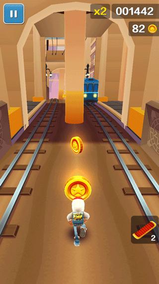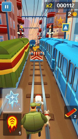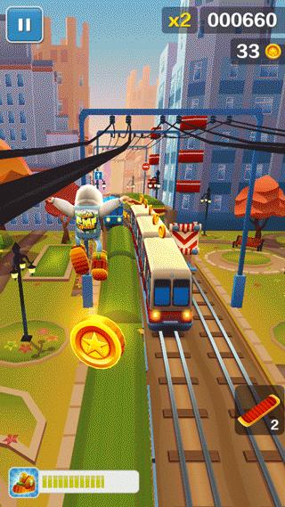 双击屏幕可启动滑板道具,如果在没有启动滑板功能的情况下,角色撞上障碍物或者火车游戏就会结束,而在滑板状态下,等于给角色买了保险,滑板会在撞到障碍物时消失,但游戏可以继续进行。滑板在消失后的几秒内出现冷却时间,当闪烁结束后可通过双击再次启动,没有次数的限制。